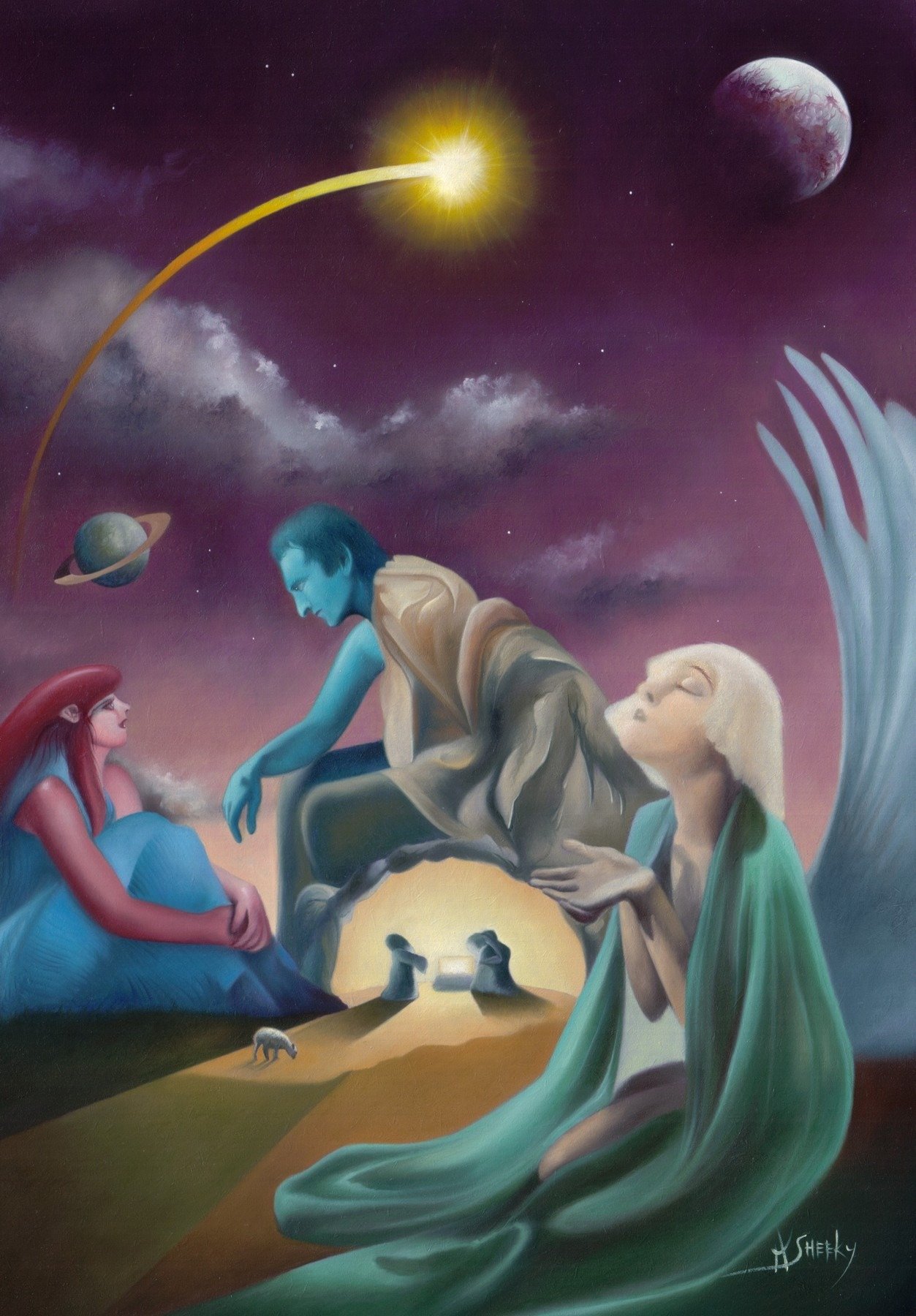 Developed as my annual Christmas card design, a regular feature in my existence since 2008. Time was short and in late October I was reminded that I had been lax in my Christmassy duties, and proceeded to start work. I began with a dome shape, sketching on my typical note paper about 8cm square. This included a small nativity, a moon, spires and soon the scene was reminiscent of Tatooine, the fictional desert world from Star Wars. Later the suddenly obvious relationship between Star Wars and the nativity came to mind, but only after I’d envisioned green skinned alien women and men draped over the scene like something from fantasy art.