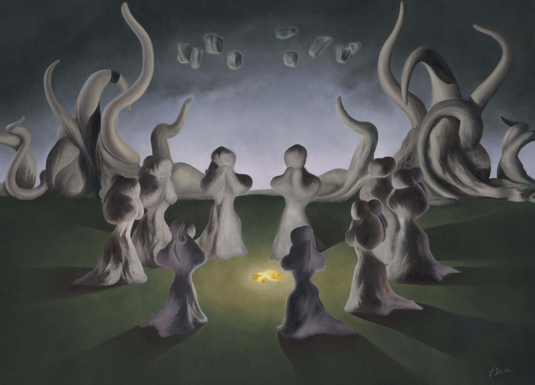 Painted for the Derbyshire Open Exhibition in 2008, a regular event that features Derbyshire related paintings. I wanted to paint something specific, and decided to paint the neolithic stone circle, the nine ladies. Despite the fact that the circle was excitingly threatened by a nearby quarry, I failed to come up with a definite good idea and it was some weeks before I arrived at this one. The key part was that the actual stone circle was visible in the sky, a reflection, or perhaps more correctly a vision of the circle seen from underneath the surface of a lake, because the picture represents the Celtic Otherworld, a supernatural domain which can be accessed through lakes. The lower half of the picture featured nine female figures of stone in a ring, each weeping in Victorian dress to represent the passing of an era in Britain, and in that respect the picture has an emotional connection to the my Albion painting. This is the a second version of this painting, painted on a slightly larger scale.