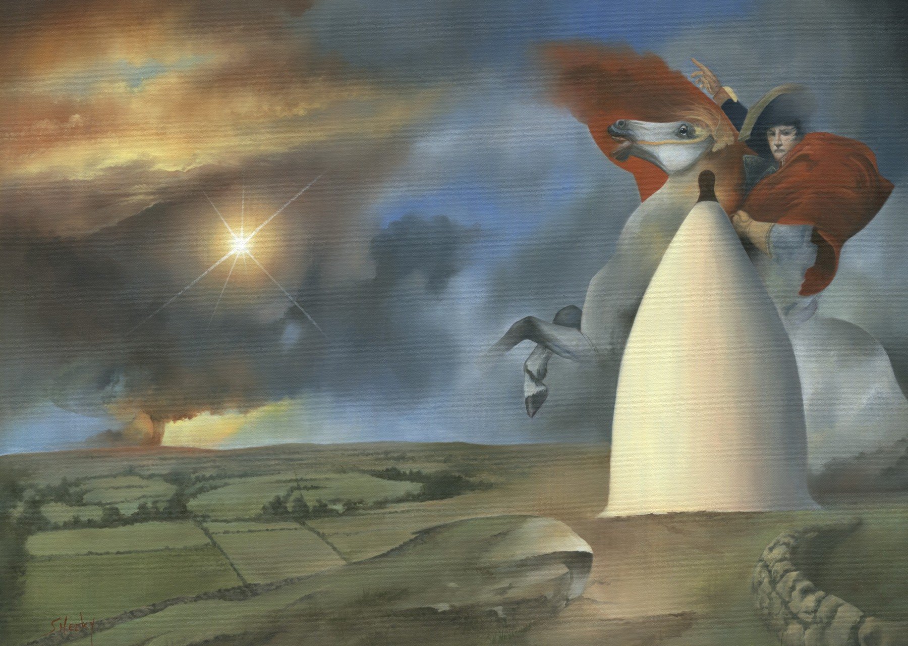 A painting of the monument The White Nancy in Bollington, Cheshire, the painting is also known as ‘The Bollington Napoleon’. A popular subject for local artists, a lady visited a gallery at which I was exhibition, asking if we had any paintings of the monument, at which point I volunteered to paint one. When composing, I made the sky dramatic, adding distant fire storm, which evoked two things, a sense of destiny, and a sense of distant war, which was present in the news as France had recently been attacked by Islamic State terrorists. The monument was made to commemorate the Napoleonic wars, and I had the vision of adding the figure and horse of Napoleon from David’s painting, charging towards that distant point, filled with gusto.